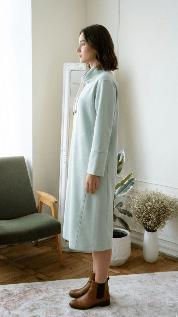 大人がきれい目に着こなせるようにデザインされた、特別なフードパーカーワンピースです。