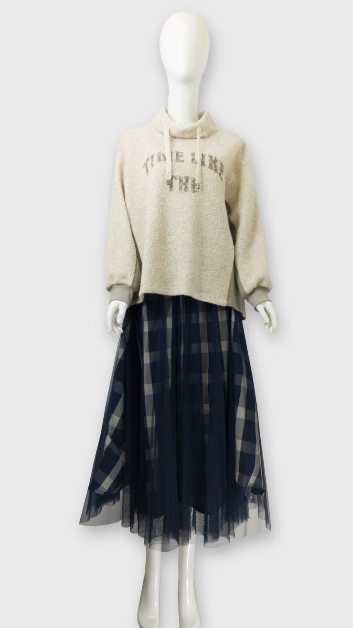 【ドラマチックなチュールスタイル】:チュール素材を表に。ウエストからフレアに広がるチュールがロマンティックで華やかな印象を与えます。インナーのチェック柄が透けることで、単調にならない深みのある表情が生まれます。